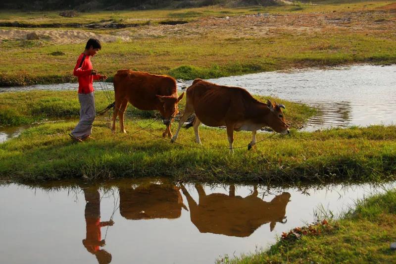 在我關(guān)于牛的記憶中還有一個非常特殊的橋段,我家喂養(yǎng)的那頭母牛每隔一兩年便會生下一個小牛犢(大部分小牛養(yǎng)個一年半載的就會被賣掉補貼家用),期間曾有一個小牛犢是在我小學放暑假期間生的,當時閑著無事的我,幾乎每天一有時間就跑去看這頭全身棕紅的小牛,很快就和它建立起了無比親密的關(guān)系。盛夏期間,我最愛去村東頭的河里游泳摸魚,在這條小河邊,有我的歡樂,也有這頭小牛的歡樂。每當我要去河邊玩耍時,這頭小牛就會搖頭晃腦的緊跟著我,當我和伙伴們在河里自在的游泳嬉戲時,小牛則在岸邊的草灘上往來飛奔,待我玩累上岸時,它又蹦跳著用它那光禿禿的腦袋冷不丁的把我頂入河中,然后揚起尾巴一溜煙跑遠了,常常惹得和我一起的小伙伴們哈哈大笑又艷羨不已。在我的堅持下,這頭小牛在我家足足待了三年有余,后來由于父親腿疼的厲害,不得不將大牛和小牛一塊賣掉了,為此我曾傷心了好長一段時間。