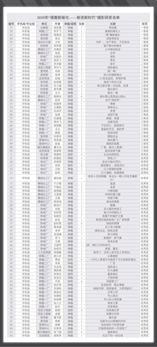 11月12日,榆化公司“鏡看新榆化——奮進新時代”攝影大賽順利完成作品審核評選,選出了相機組和手機組一等獎、二等獎、三等獎、優 秀獎的全部獎項。