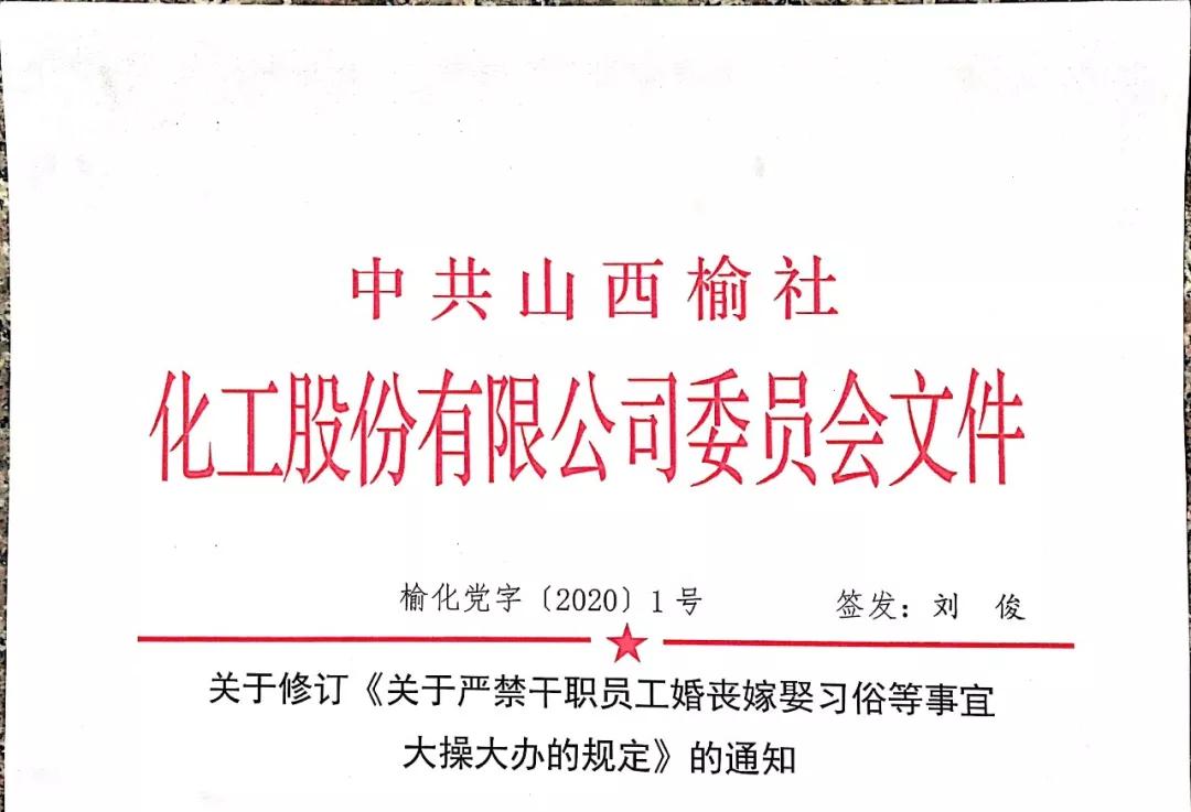 “經(jīng)辦婚喪嫁娶習(xí)俗事宜要摒棄陋習(xí),做到文明健康。副廠、部級以上領(lǐng)導(dǎo)遇本人結(jié)婚或子女嫁娶,要向公司監(jiān)事會申報。喪事一律選用大燴菜,結(jié)婚或子女嫁娶宴請酒席飯菜可采用大燴菜或六菜一盆(盆:燴菜)”。