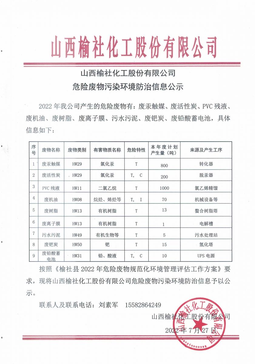 山西榆社化工股份有限公司 危險廢物污染環境防治信息公示
