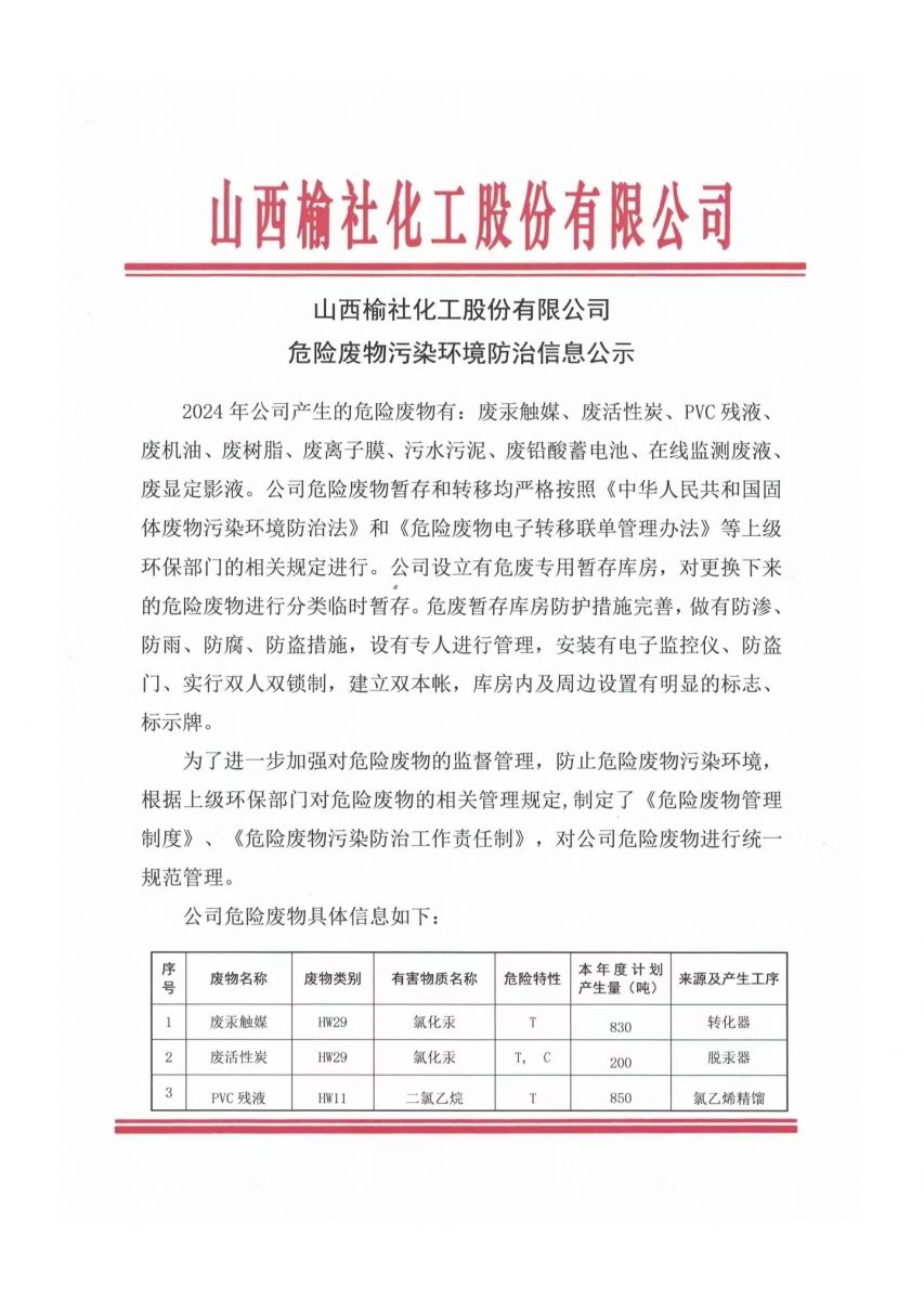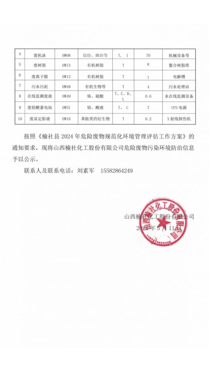 山西榆社化工股份有限公司危險(xiǎn)廢物污染環(huán)境防治信息公示