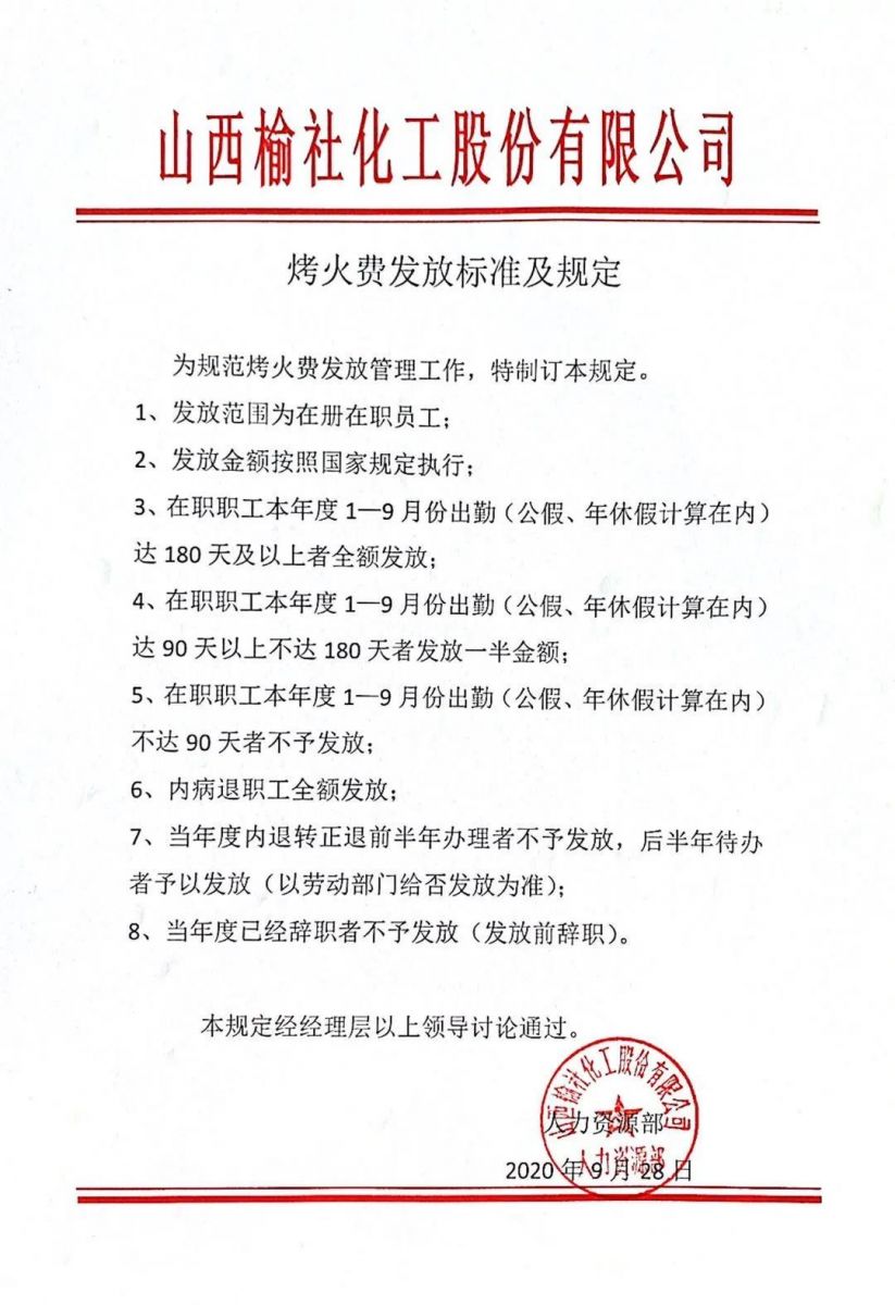 本次烤火費發放涵蓋總公司、遠安物流、榆化精細化全體在冊在職員工共計2811人,按照國家3360元的標準執行,共計發放總金額939.96萬元。