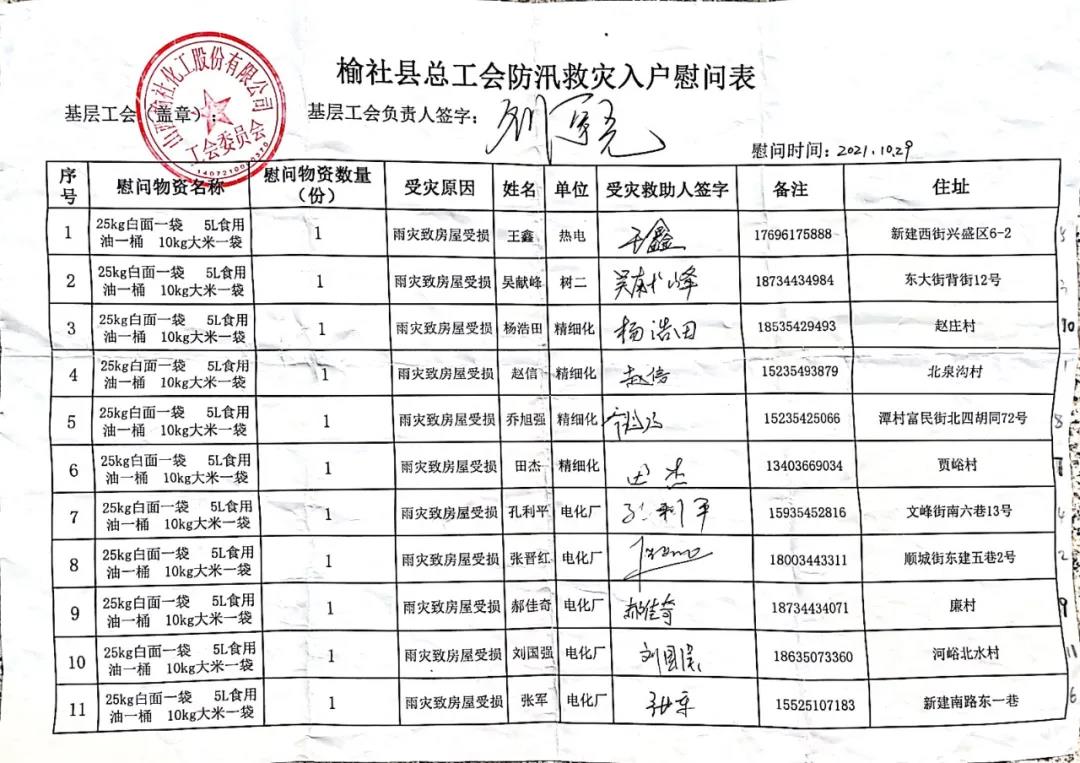 “這次連續強降雨讓不少街坊鄰居受災受損,公司及時給我們送來了慰問物資,保障了我們的基本生活,也更增加了我們災后重建的信心,真正感到了做榆化人的幸福與自豪。”拿到慰問物資的員工紛紛感謝公司的溫情關懷和工會組織的熱情慰問。