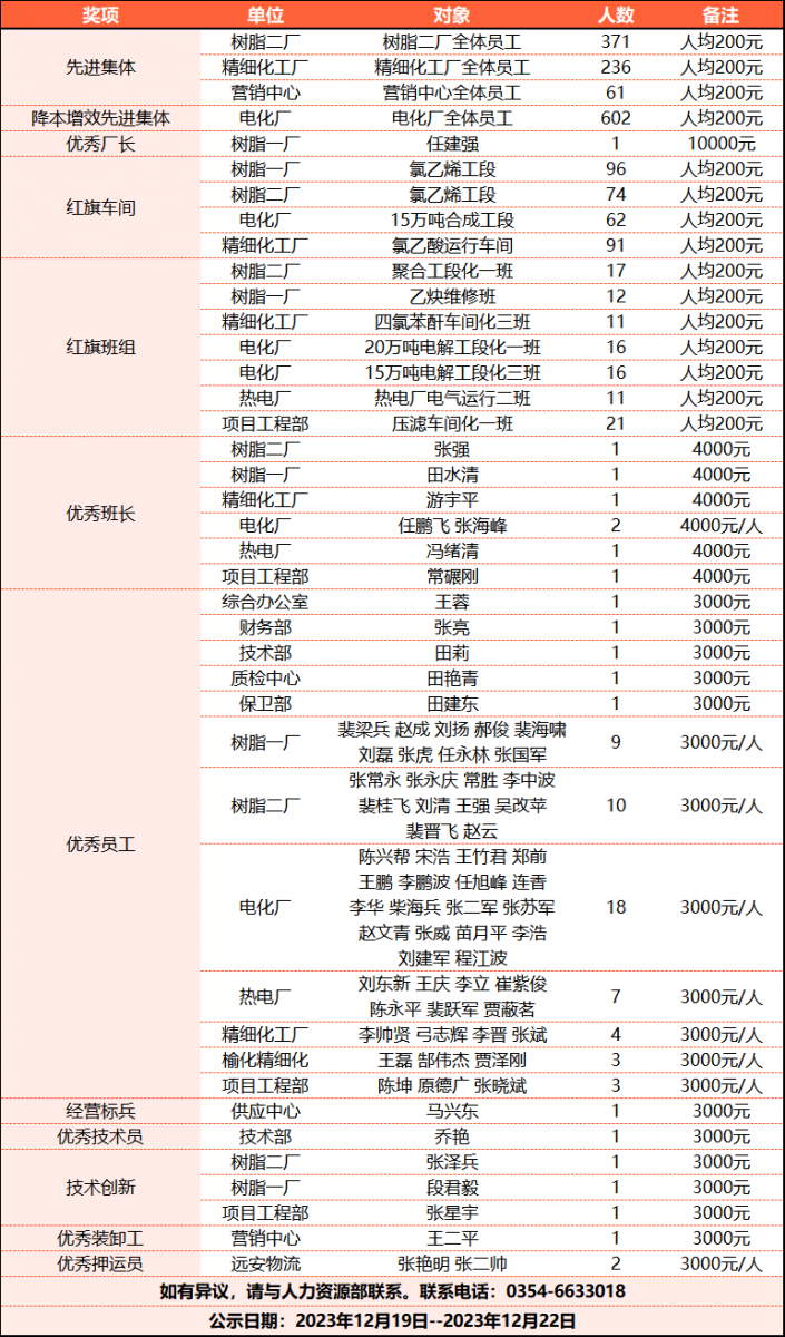 依據《榆化公司2023年度表彰獎勵的通知》要求,結合各單位推選出的先進個人,2023年度共評選出先進集體3個、降本增效先進集體1個、優秀廠長1名、紅旗車間4個、紅旗班組7個、優秀班長7名、優秀員工59名、經營標兵1名、優秀技術員1名、技術創新3名、優秀裝卸工1名、優秀押運員2名。