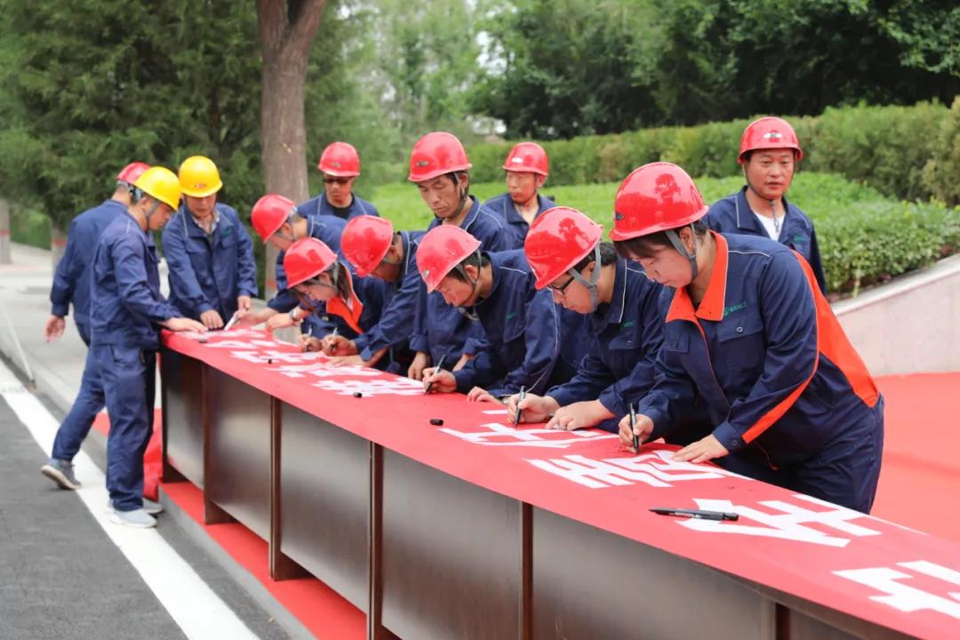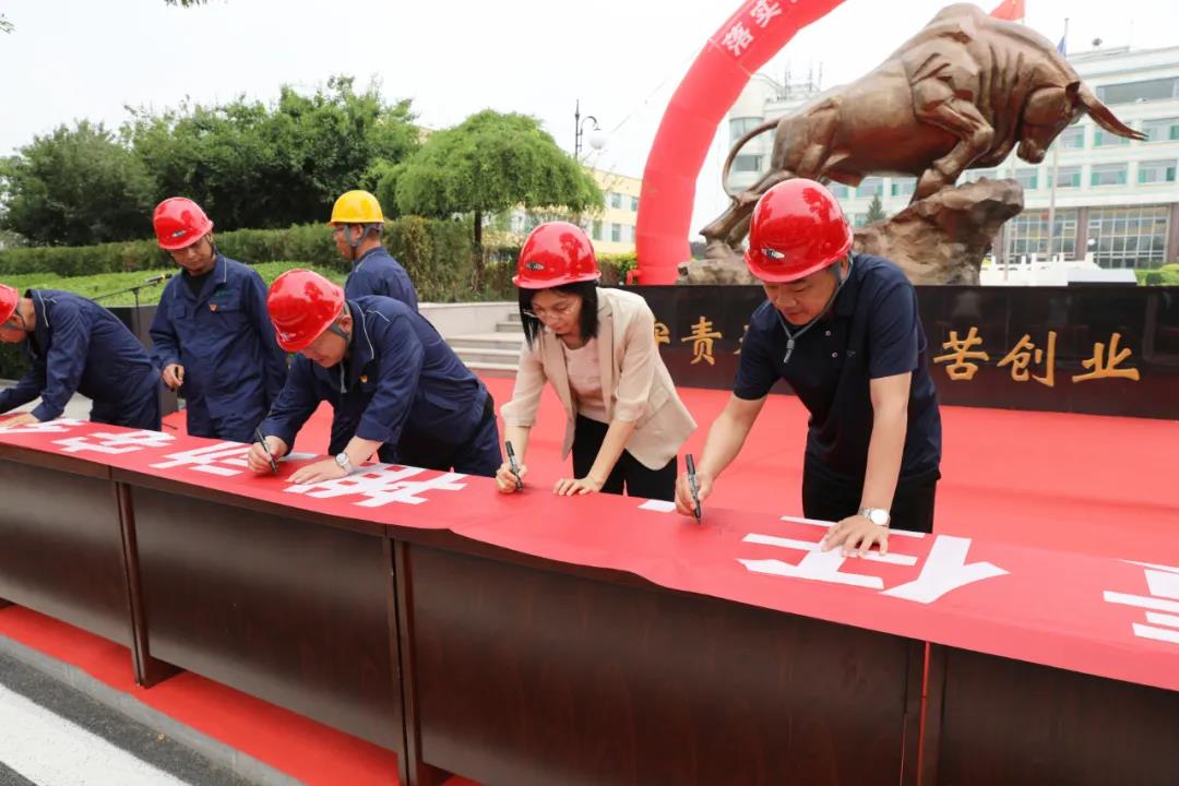 第三項,縣領導、公司領導、員工代表在“落實安全責任,推動安全發展”主題條幅上表決簽名。