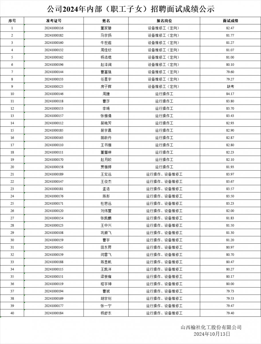 公司2024年內(nèi)部(職工子女)招聘面試成績公示