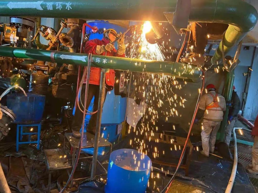 第二天早上5點多鐘,星月猶明,寒意正盛,樹脂二廠聚合樓前所有參與更換聚合釜內(nèi)冷管的干部員工已全部到齊,開始了更換前的籌備工作,出料、置換、分析合格、現(xiàn)場安全措施確認(rèn)等一系列準(zhǔn)備工作后,天微微亮,任廠長再次對所有參與此次作業(yè)人員進(jìn)行了安排部署,著重強調(diào)了所有工作必須在保證安全的前提下進(jìn)行,最后不失風(fēng)趣的說道:“同志們,加班飯管夠吃,加班錢管夠掙,咱們一定要安全順利的完成此次任務(wù)!”隨著一聲令下,幾十號人全部投入了緊張的工作之中,吊車、電焊、扳手、倒鏈、軟梯等輪流上場,現(xiàn)場作業(yè)緊張卻有序的進(jìn)行著,干部全程盯守,鉗工一個個奮力擰螺絲的表情、焊工一個個專注的神情、現(xiàn)場干部一雙雙銳利的眼睛、對講機里一遍遍的問答,此時此刻,所有的人心都凝聚在一起。