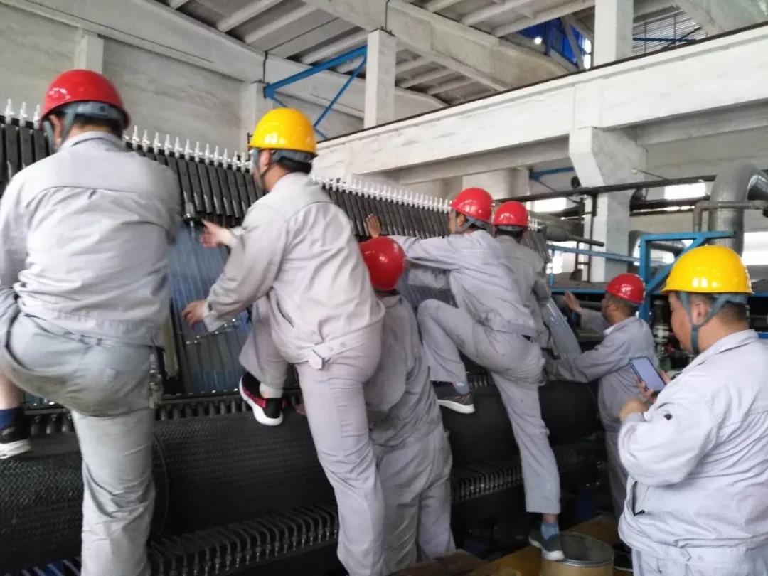 近日來,高溫天氣持續不斷,電解廠房檢修現場的溫度更是高達35℃。為了按時完成電解槽組裝,早日開車投產,分廠領導守在現場、緊盯目標,監督協調組裝工作;檢修工人嚴謹細致、團結協作,一個個忙的汗流浹背,卻從未放慢電解槽組裝的節奏。干部員工齊上陣,戰高溫、斗酷暑、保進度,現場作業井然有序。