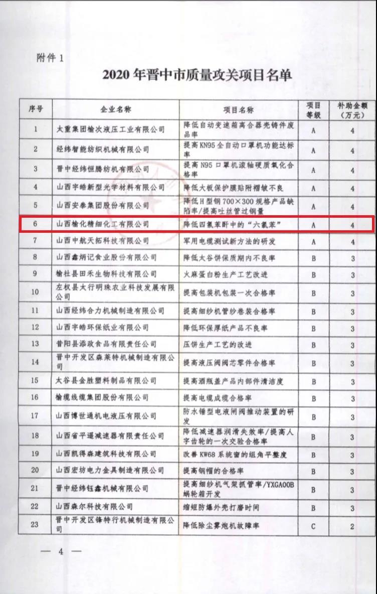 近日,2020年度晉中市質(zhì)量攻關(guān)項(xiàng)目名單揭曉,山西榆化精細(xì)化工有限公司申報(bào)的《降低四氯苯酐中的“六氯苯”》獲得A類(lèi)的優(yōu)異成績(jī)。